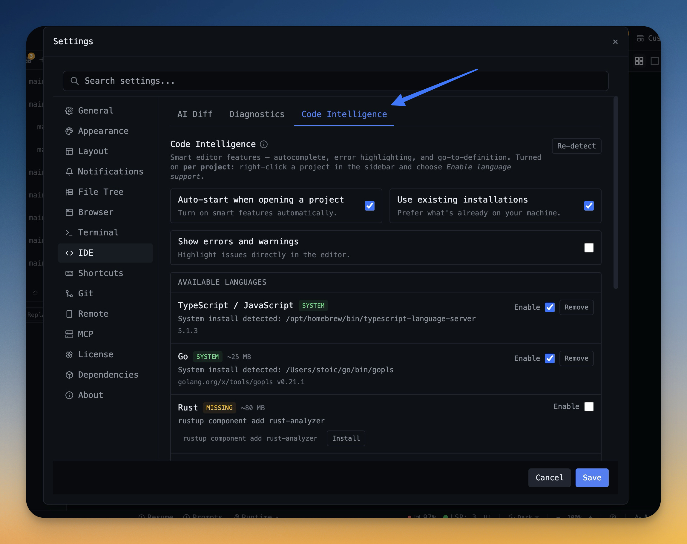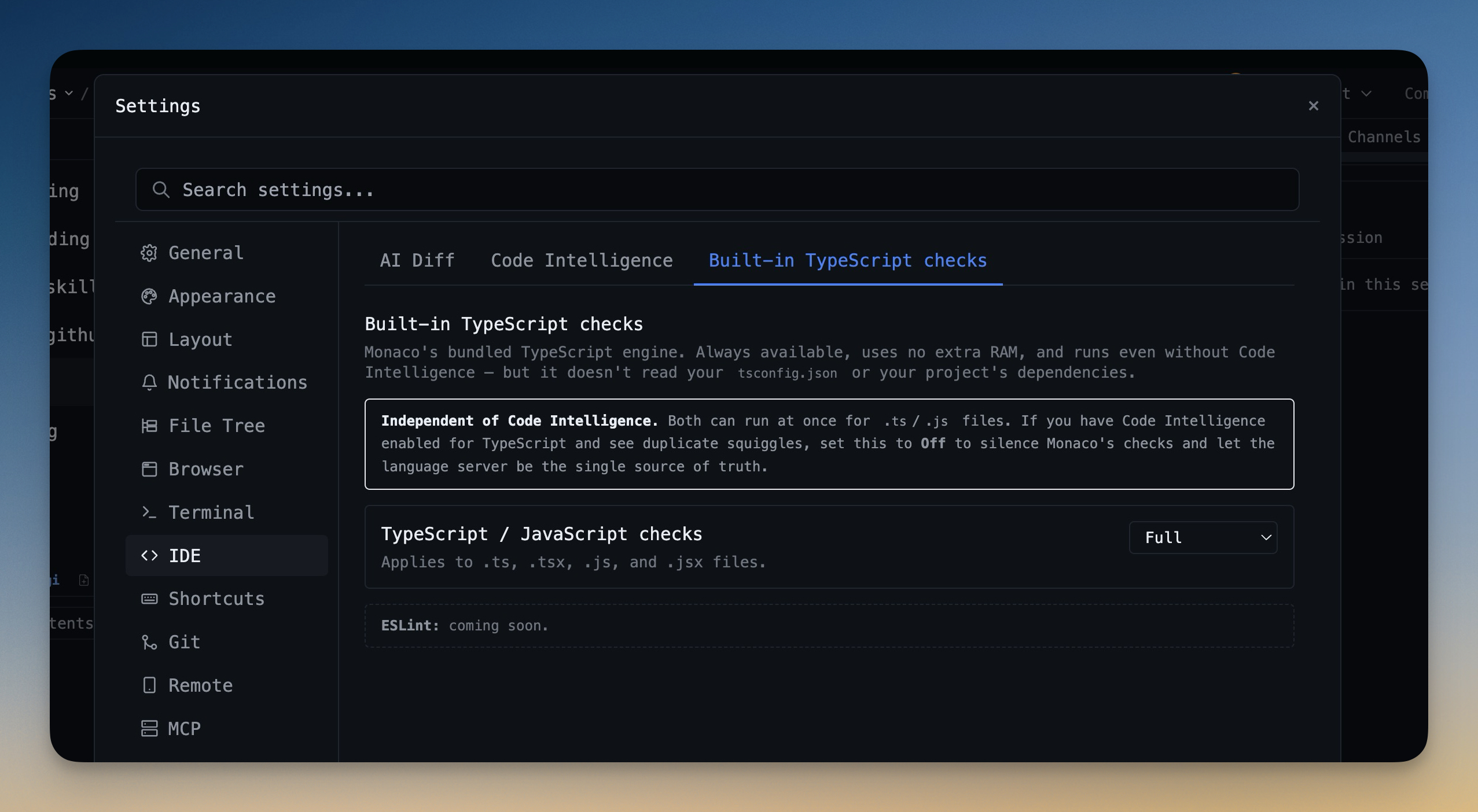Both Code Intelligence and AI Diff live in the IDE settings tab, and the IDE tab has been reorganized with sub-tabs to hold them. AI Diff, Code Intelligence, and Built-in TypeScript checks each get their own focused page so the settings dialog stops being a giant scroll. Click the sub-tab at the top of the IDE tab to switch between them.