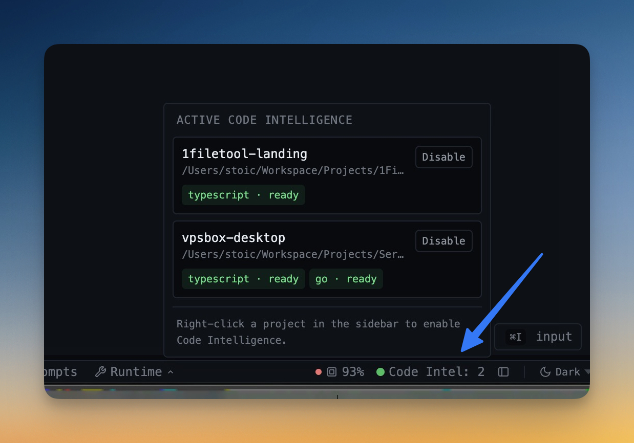 Once at least one project has Code Intelligence active, a green dot, a brain icon, and an active project count appear in the bottom status bar. Click the icon and a popover lists every active project, every engine it's running, the live status (ready / starting / crashed), and a Disable button per project. This is the emergency-stop UI: if your machine is under memory pressure, one click frees the entire 200–500 MB an engine is consuming.