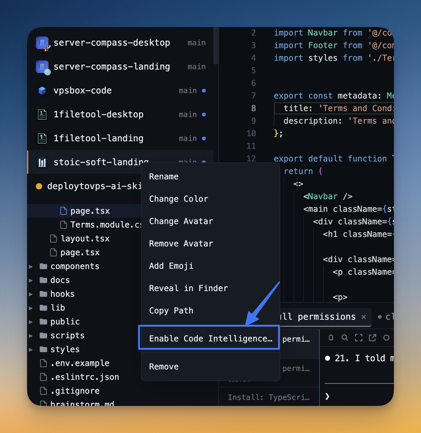 Right-click any project in the sidebar and pick Enable Code Intelligence… A dialog scans the project, lists every language it detects, and shows the file count for each (55 TypeScript files, 12 Python files, etc.) along with the installed engine version. Languages whose binaries are present on your machine are pre-checked; languages it detected but couldn't find an engine for show up in a separate Detected but not installed section with a hint for the install command (npm install -g typescript-language-server, pip install pyright, and friends).