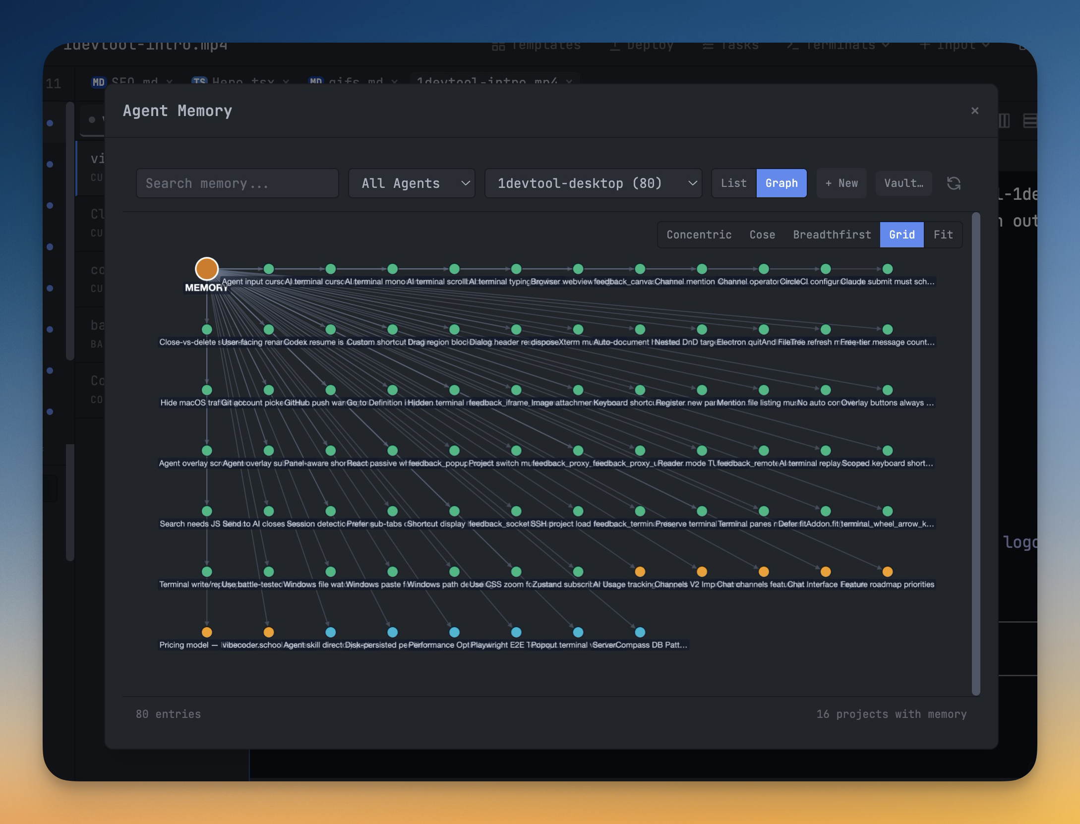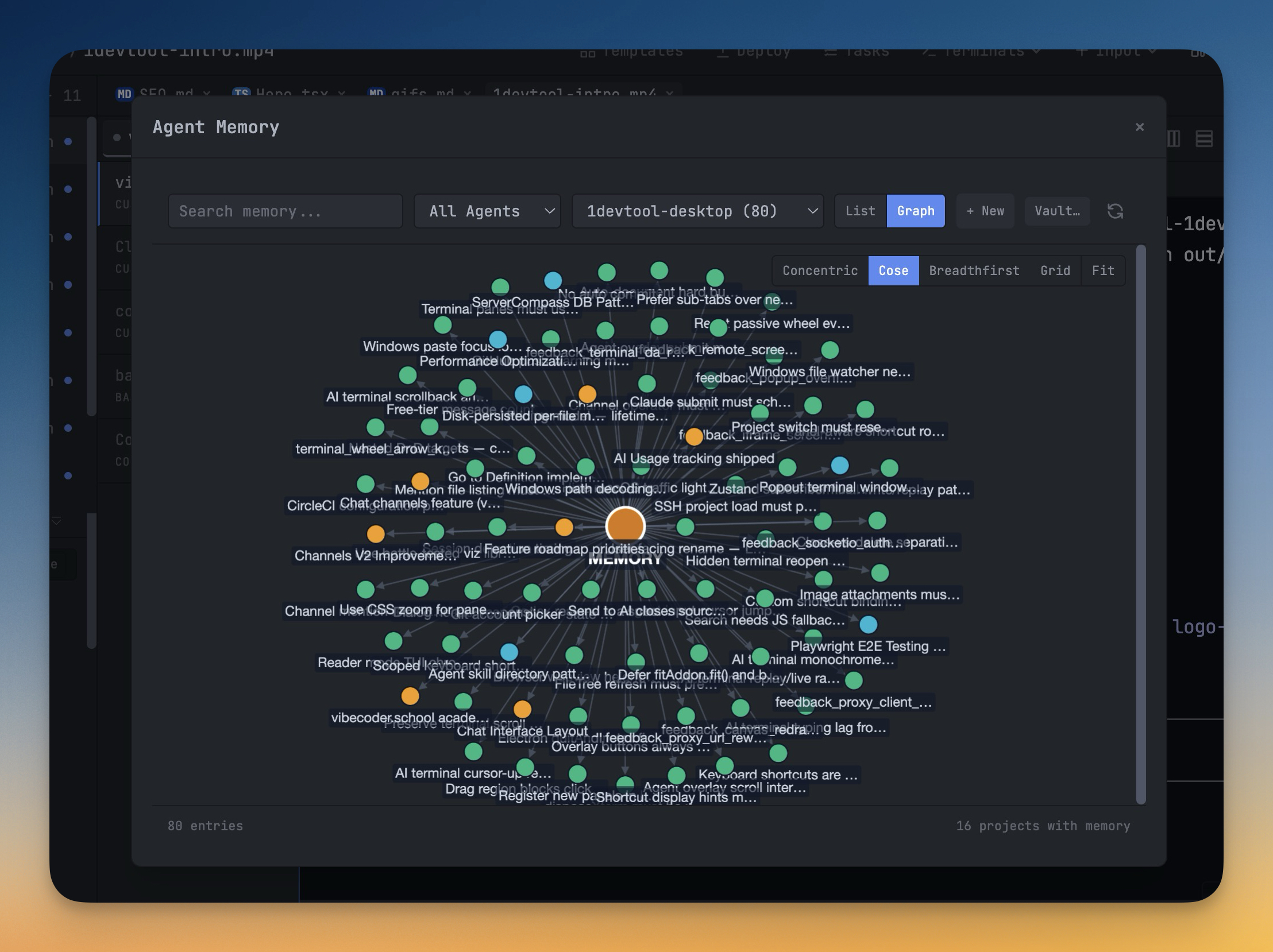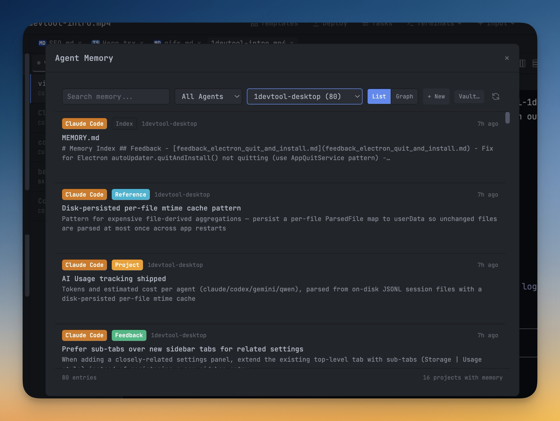 Claude, Codex, Gemini, and Qwen all write memory entries to disk in their own formats and locations, so your accumulated "what the AI remembers" knowledge ends up fragmented across a dozen dotfiles you'll never hand-edit. The Memory Manager reads every agent's memory across every project and renders them in a single panel you can actually use. Filter by agent and project with two dropdowns to narrow "all Codex memories" or "Claude memories for this one repo." Toggle from List view into an interactive Graph view — Cytoscape lazy-loads only when you switch, memoized filtering keeps hundreds of nodes smooth, and you can see at a glance how memories reference each other across projects and agents. Create and edit entries inline in the Markdown editor with autosave, instead of opening a text editor and hoping you don't corrupt the format. And when you want your AI memories to live alongside the rest of your notes, the Obsidian export writes every entry as a Markdown file into a vault folder you pick, preserving the agent/project folder hierarchy so your memory archive becomes first-class notes you can browse, link, and search in Obsidian.
