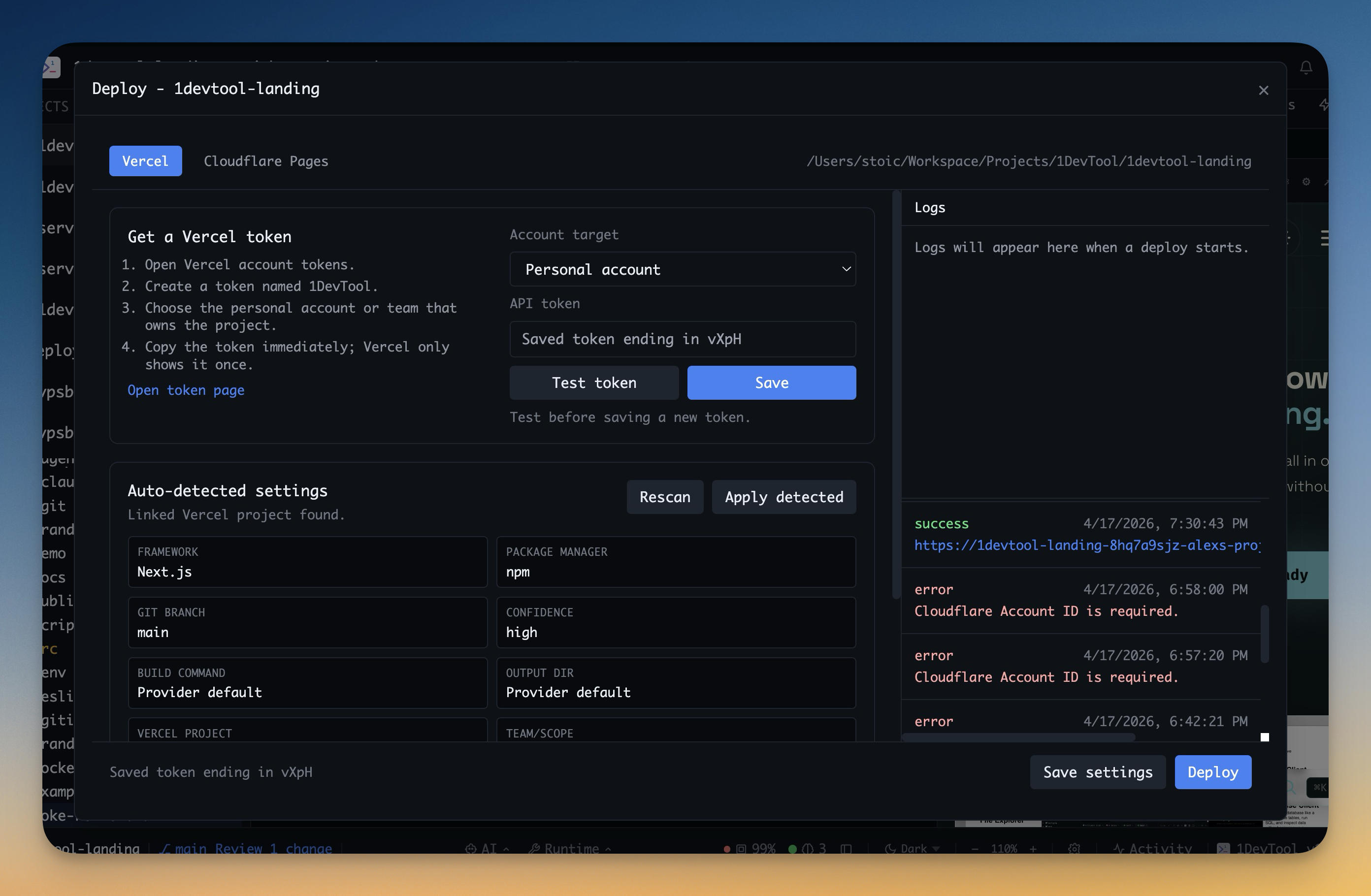 Scan the current project, suggest the right build settings, and deploy with inline logs without leaving 1DevTool.