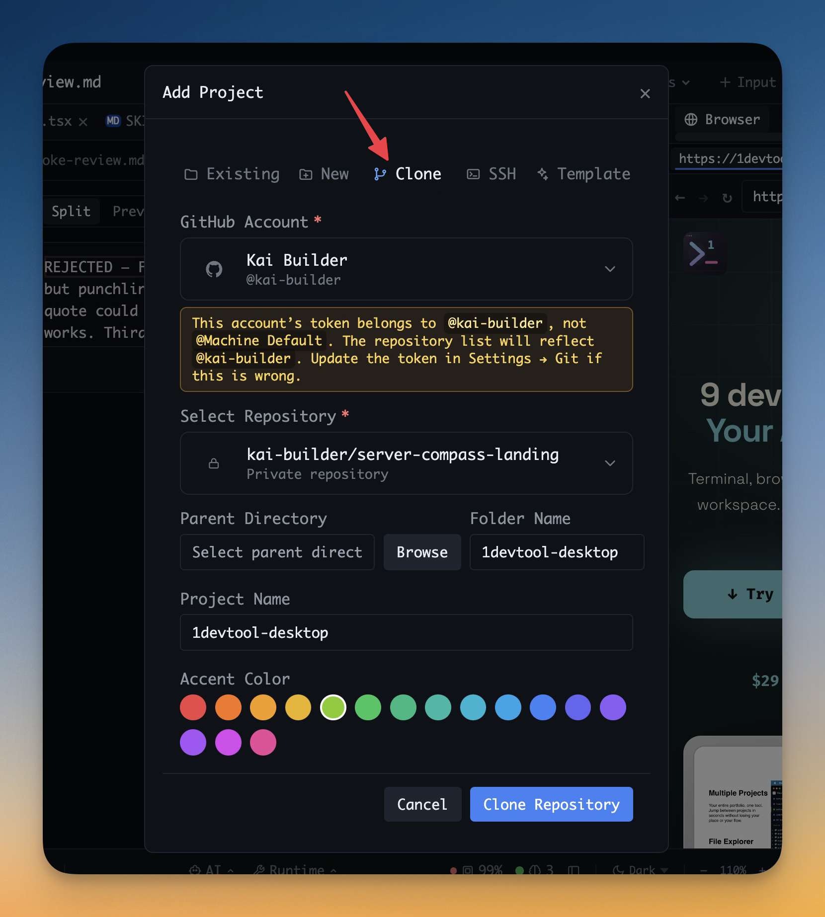 Project onboarding should not start with copying clone URLs between the browser and the terminal. If you already connected your GitHub account to 1DevTool, the app should know which repositories you can access and let you pull one in immediately. This flow shortens repo setup from a manual ritual into a guided Add Project path with the right identity already attached.