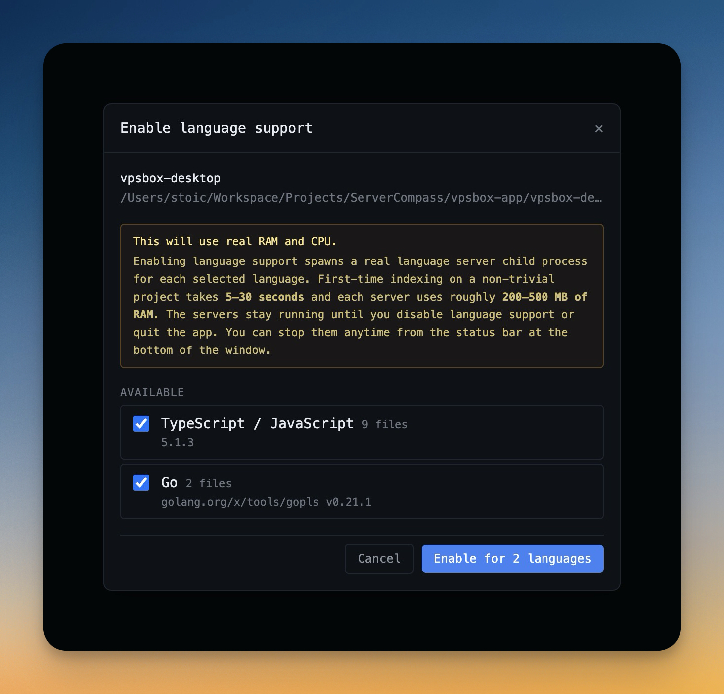 Monaco's sandboxed TypeScript worker can't read your `node_modules`, your `tsconfig.json`, or your `*.d.ts` files — so it spends all day flagging fake errors on every CSS module import, every JSX element, and every "react/jsx-runtime" import. Code Intelligence solves this by spawning a real language server (typescript-language-server, gopls, pyright, rust-analyzer, clangd, solargraph, intelephense, or sourcekit-lsp) per project you explicitly opt into. The engine reads your actual `tsconfig.json`, `node_modules`, and type declarations, so the squiggles you see are real and the false positives finally go away. Right-click any project in the sidebar and pick "Enable Code Intelligence…" — a dialog scans your project, lists every detected language with file counts ("55 TypeScript files") and the installed engine version, and lets you turn on the ones you want. Engines only spawn for projects you enable, so memory cost is bounded by your choice (200–500 MB per engine) instead of automatic background spawning. A green brain icon in the status bar shows every active project with a per-project Disable button as the emergency-stop UI for freeing RAM in one click. Eight languages out of the box: TypeScript / JavaScript, Python, Go, Rust, C / C++, Ruby, PHP, and Swift — all detected automatically by file extension. The choice persists across app restarts, so engines respawn next launch without you re-enabling them.