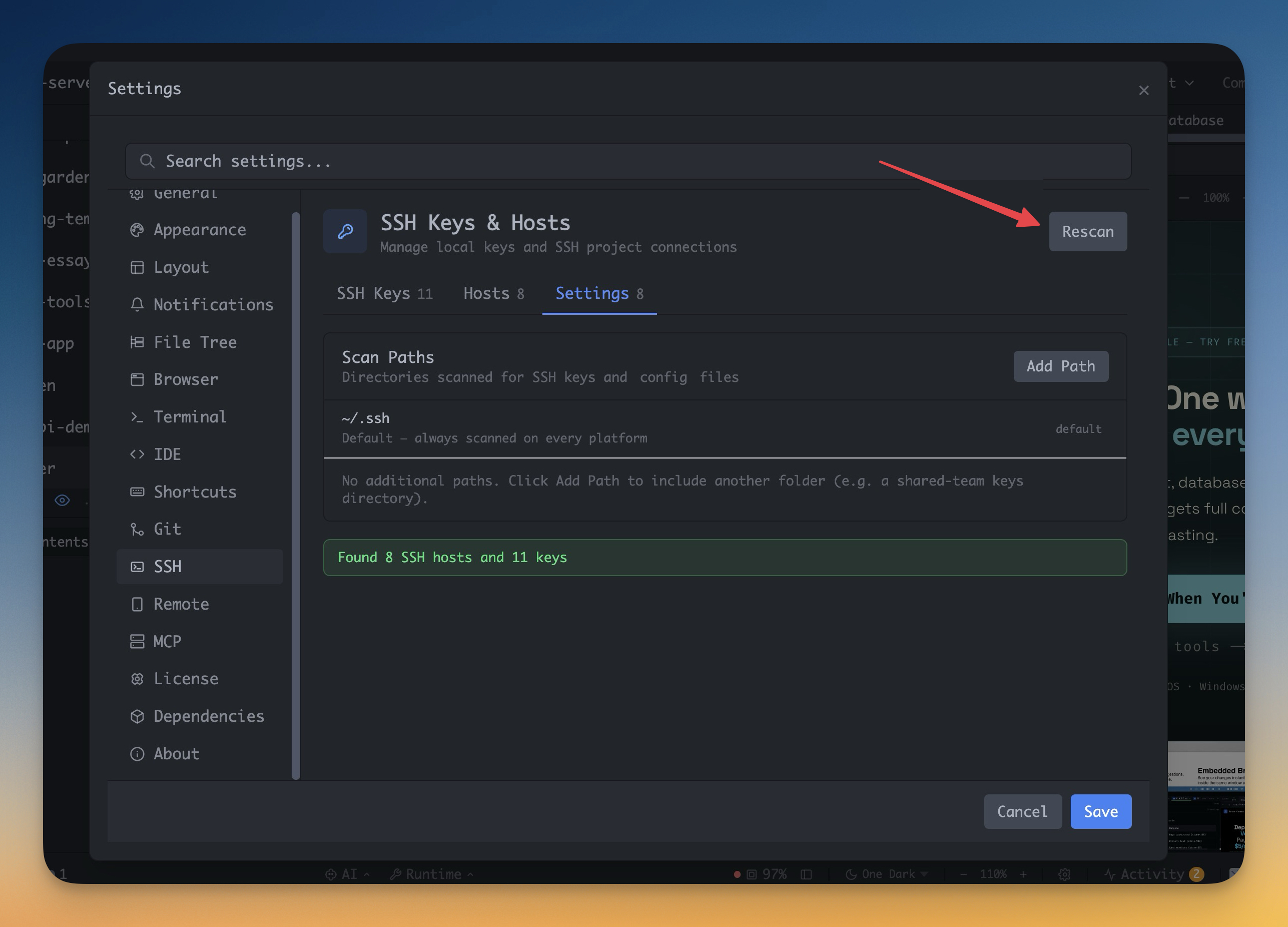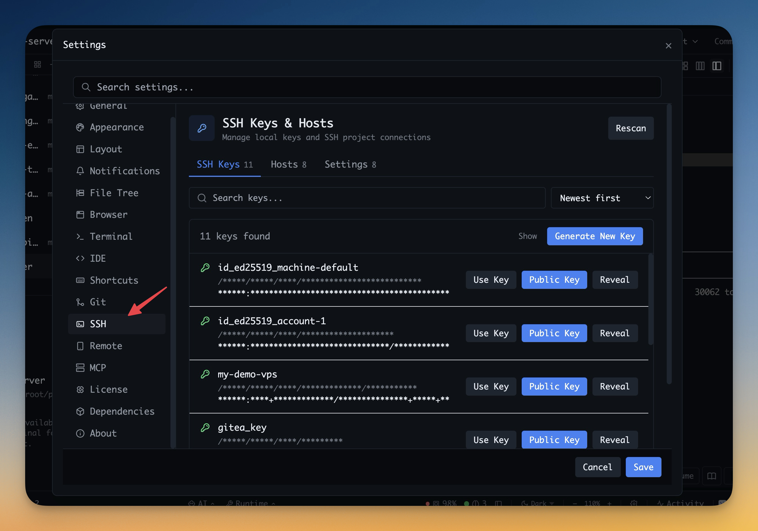 Manage saved SSH hosts, inspect loaded keys, generate new keys, and see what is available before opening a remote project.