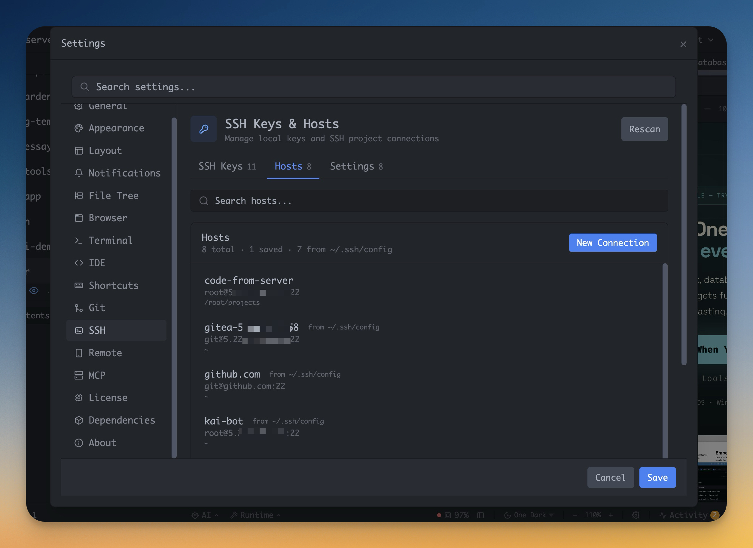 One SSH inventory powers later remote project onboarding instead of forcing repeat setup.