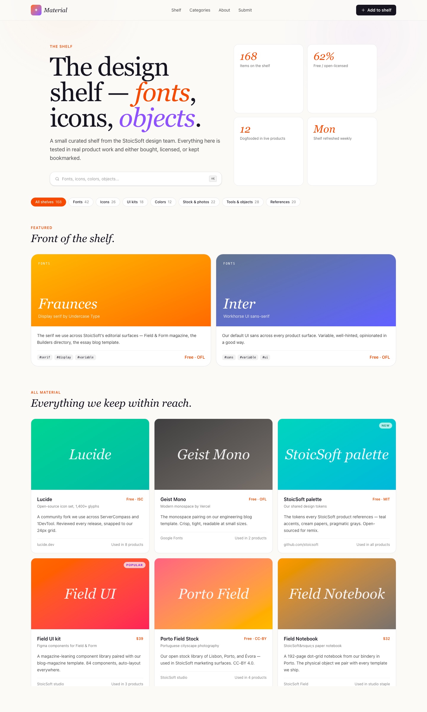 Visual shelf-style directory for fonts, icons, UI kits, and objects. Cream + vibrant gradients, large card previews, serif display headings.