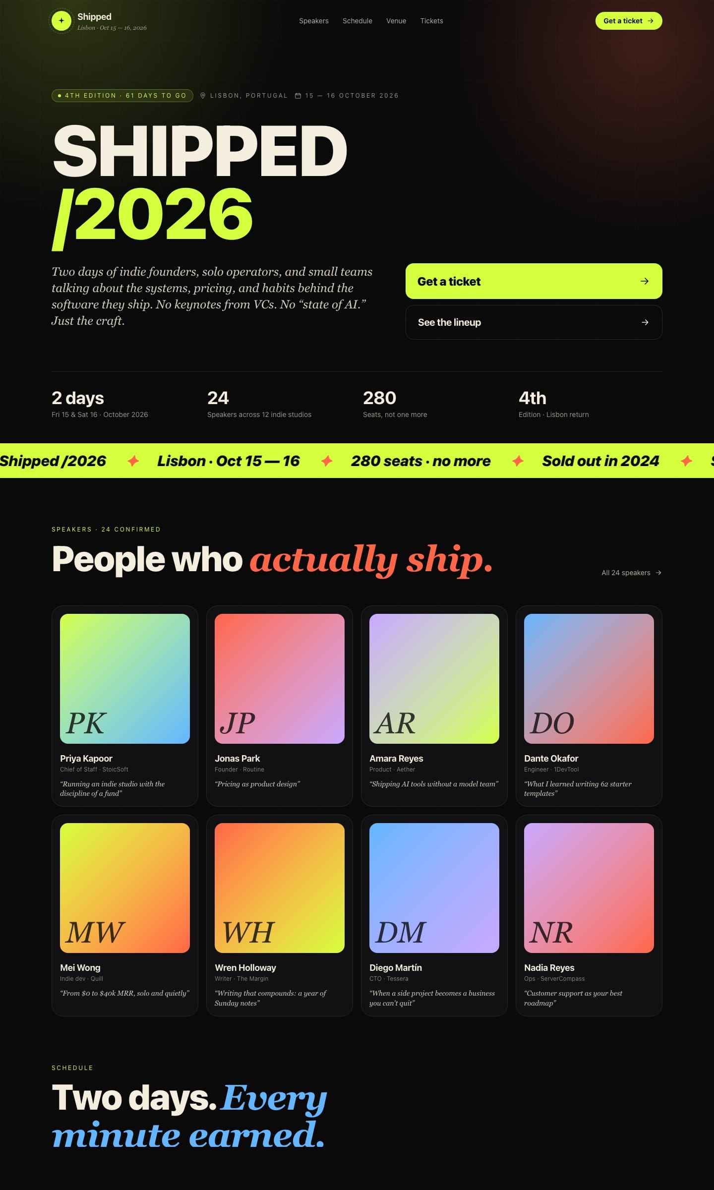 Bold tech-event landing with oversized display type, speakers grid, two-day schedule, venue info, sponsors, and tiered tickets. Inspired by Shipped /2026.