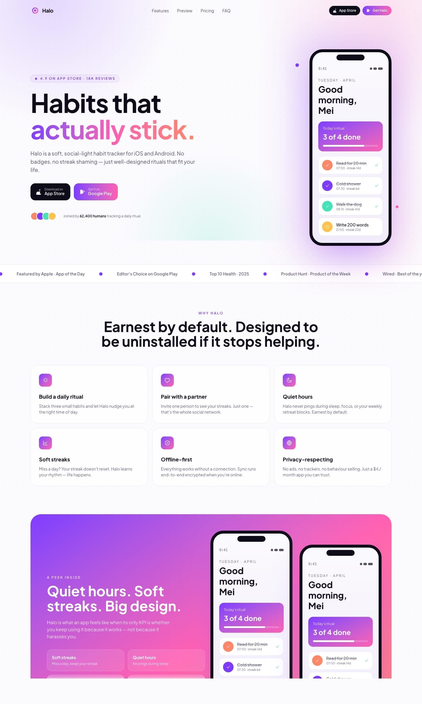 Consumer mobile-app showcase with phone mockups, vibrant gradient hero, App Store and Google Play CTAs, reviews, and pricing.
