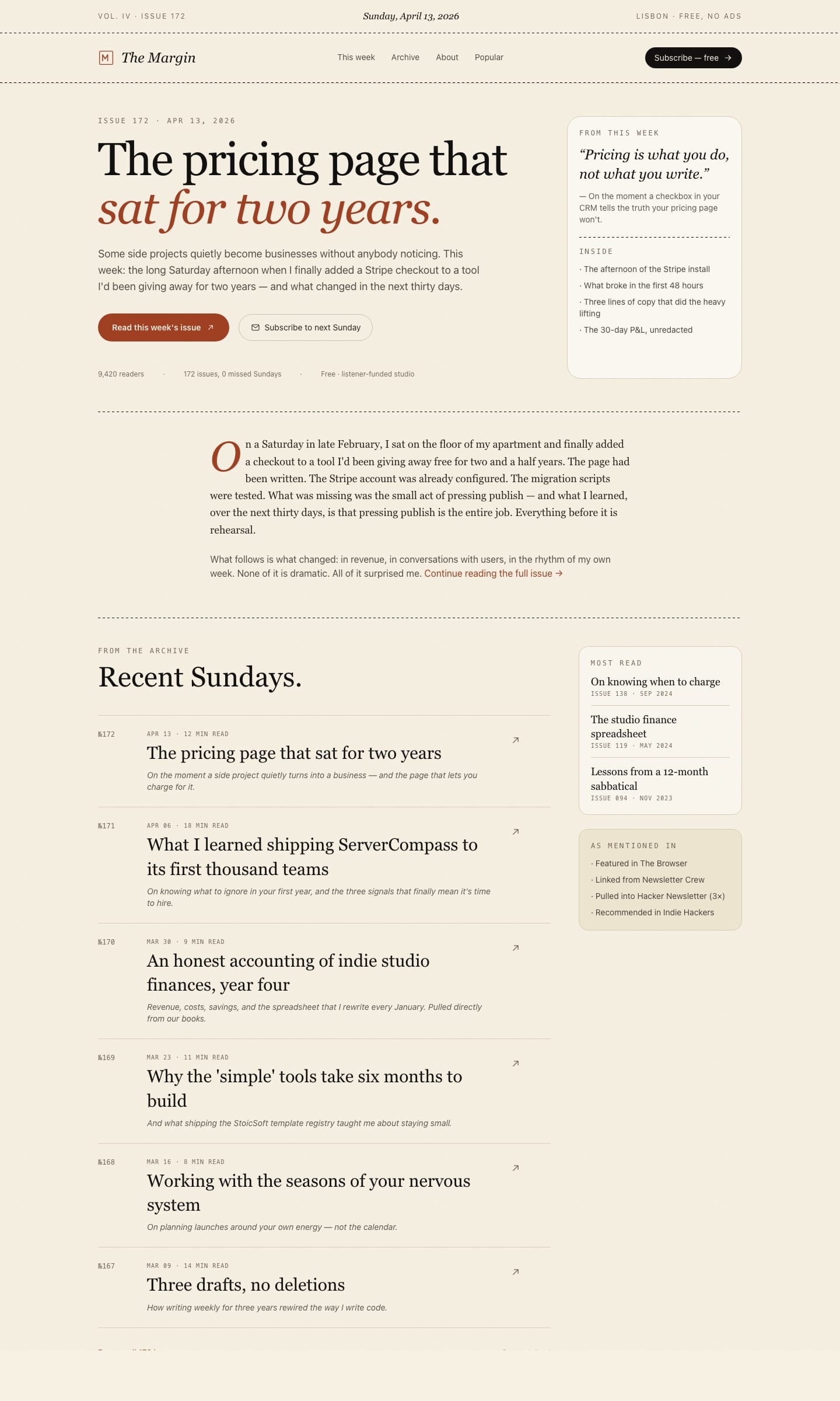 Editorial newspaper-style newsletter landing with masthead, current issue excerpt, archive, about page, and subscribe form. Cream paper aesthetic.