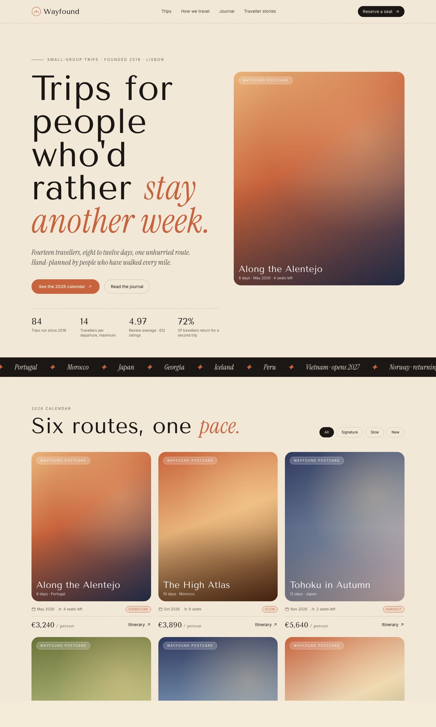 Warm small-group-travel landing with postcard trip cards, sample itinerary, rules of how we travel, traveller stories, and booking. Tenor Sans + Instrument Serif.