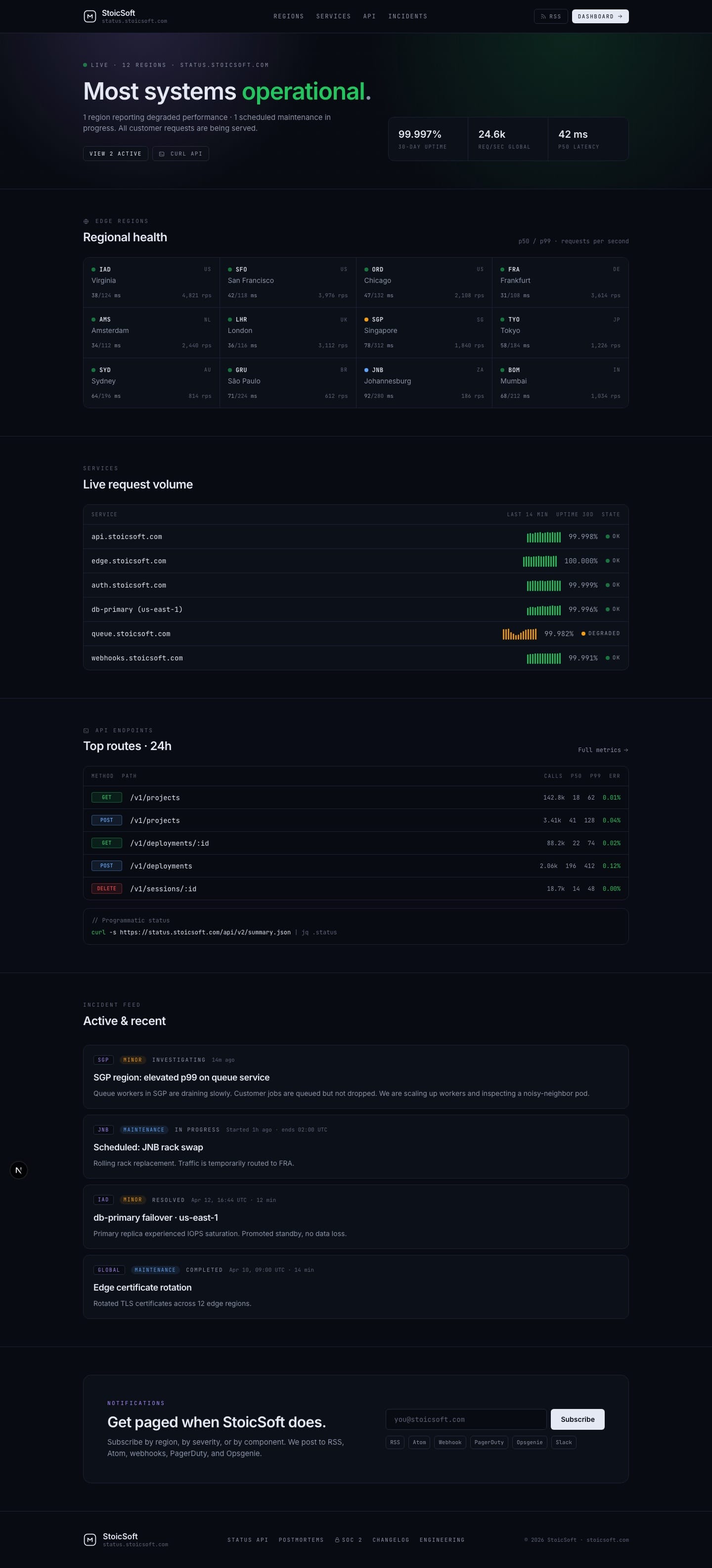 GitHub/Cloudflare-style dark developer status page with 12-region health grid, service sparklines, live API route metrics table, curl snippet, and incident feed with severity tags. StoicSoft branded.